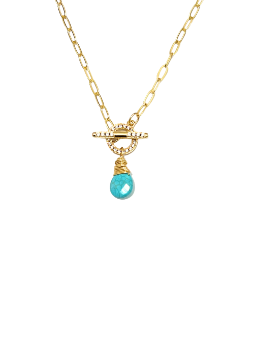 The dainty Olivia necklace has a teardrop gemstone and CZ circle toggle closure. The bead size may vary slightly but should be approximately 1/2" by 1/4".